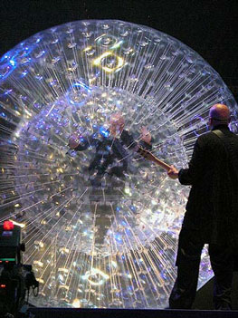 The Berlin Velodrom was a welcome change after the giant venues of Stockholm and Hamburg. It is much smaller and has a rather low ceiling, which made for a very comfortable atmosphere. The sound was delightfully direct and free from echoes even in the back rows. Because of the low ceiling the Up stage was hung lower than usual so that the “egg” that is lowered during Secret World would hover a mere metre [3.5ft] above the stage. This meant that Gabriel could not stand below it and stick his head into it like he did on other shows, but he simply lay down beneath it.