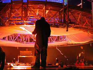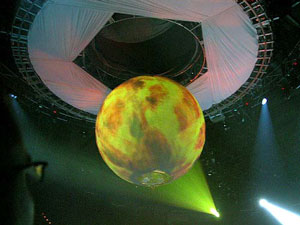 The Globen Arena is a very impressive venue already from the outside. It is a huge white dome that resembles an oversized radar station. There were therefore absolutely no problems fitting the stage into the place – the ceiling certainly was high enough. Unfortunately, only half the tickets had been sold, despite Stockholm carrying the proud name of official European Cultural Capital 2003. The venue is seating-only and the comfy and relaxed atmosphere is increased by the fact that the floor was covered in carpet.