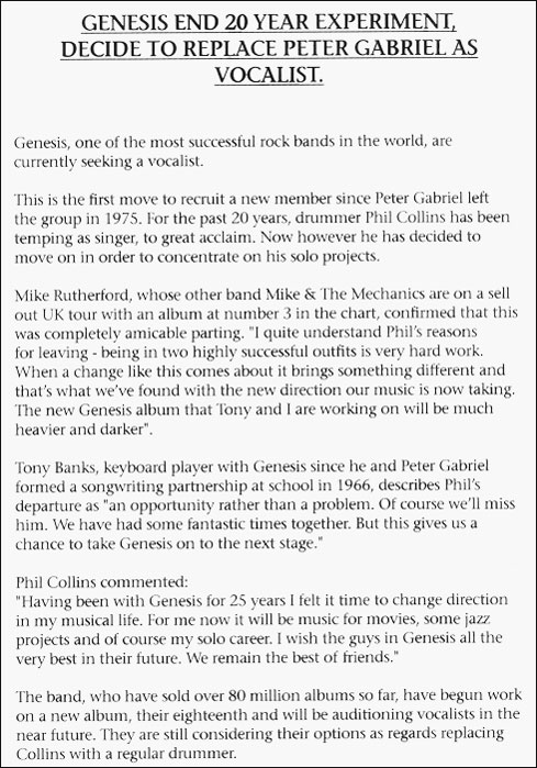 On March 28, 1996 Hit & Run faxed us the press statement (see below) about Phil Collins’ departure from Genesis. Because of its importance we would like to publish it here. A couple of things are interesting (beyond the actual content). There is the peculiar title that tells us Genesis ended a “20-year experiment” (was that all it was?) and decided to replace Peter Gabriel as the singer (had they not done that in 1975?). Then there is the fact that Tony and Mike are apparently not bothered very much at all about having to work without Phil in the future, and that they are looking for a new singer. The duo are glowing with optimism about the new material. Collins leaves with a friendly nod and also leaves little doubt that he will have lots of other things than Genesis on his mind.