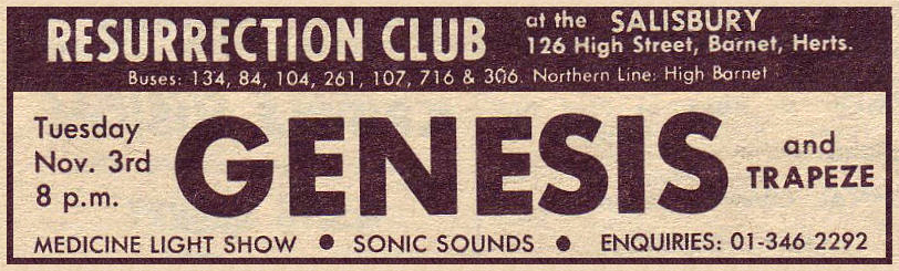 On 31st October and 1st November Genesis were to take part in the 2nd Grand Benefit Festival at Sussex University in Falmer (Brighton). A poster and a flyer are available. Whether they actually played there on one of the two days is disputed. It is possible and understandable that the gigs were cancelled in favour of further rehearsals with Mick Barnard.
