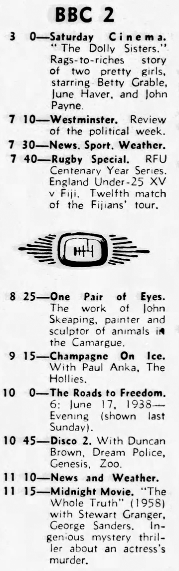 And when asked about Genesis' first TV appearance, on a programme called Disco 2 [14], Mick answers in the same interview in Dusk: „Yes. Very much so. It was quite a job. We actually had to take some equipment which was silly as we weren't playing it. Yes they did a nice backdrop which from our point of view was blue and they superimposed some war scenes on it. When that was broadcast we were playing in Watford Town Hall supporting Johnny Winter. And I rushed back because that was not too far from my house and I just managed to get in my house to see us performing on Disco 2. But I've never been able to trace that copy. I'd love to have found a copy of that. I tried for months through the BBC but apparently all copies have been deleted. Does anybody have a copy?“