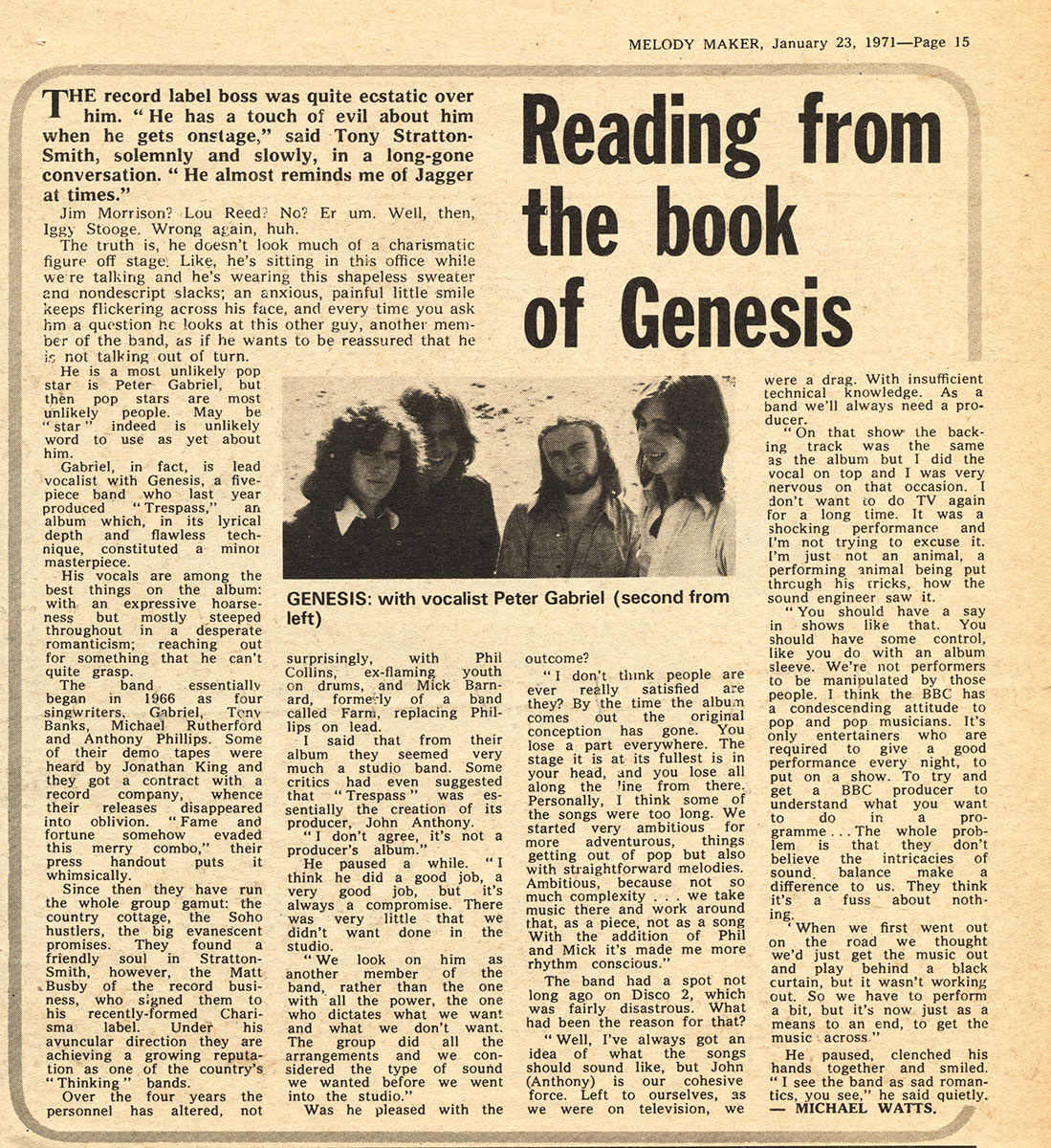 In the search for further evidence of Barnard's time with Genesis, unfortunately not much can be found in the music press. On the one hand, there is an article by Jerry Gilbert in the music magazine Sounds from 26 December 1970, which reports on the concert on 20 December in Godalming and also mentions Mick.