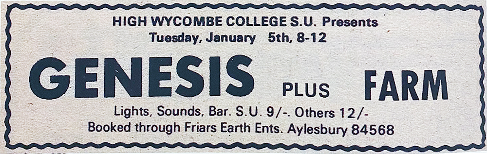 The report of an eyewitness to the concert on 16 December 1970 in Aylesbury is also interesting: „Yes Genesis did play a show at Aylesbury Grammar School with Mick Barnard. I know as I was there. Admittance was for the schools pupils only so I took a microphone with me and without missing a beat I waved it at the door manager saying 'roadie' and walked straight in.