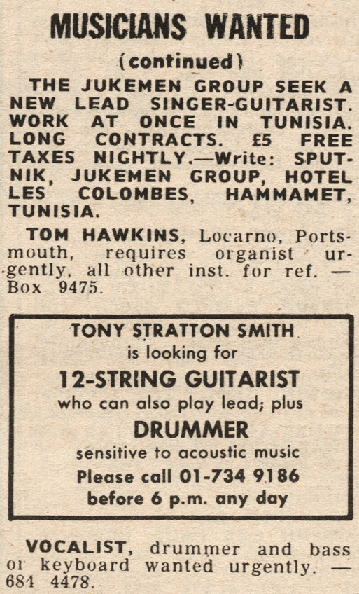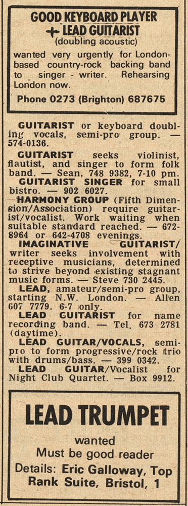In 1970, the famous advertisement in the Melody Maker of 12 December read: "Imaginative Guitarist/writer seeks involvement with receptive musicians, determined to strive beyond existing stagnant musical forms – Steve".