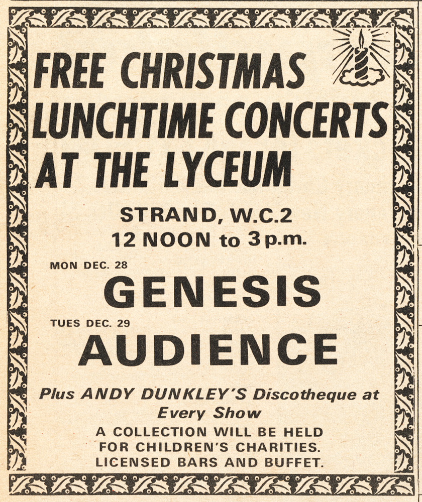 Before Steve Hackett joined Genesis, he saw them at the Lyceum on 28 December 1970 (with Mick Barnard, at one of his last shows with Genesis): „Before I joined Genesis, I saw them at the Lyceum. I was impressed and I was aware I had a lot to learn to keep up with them, but I was aware there were ideas I could give them.“ [21]