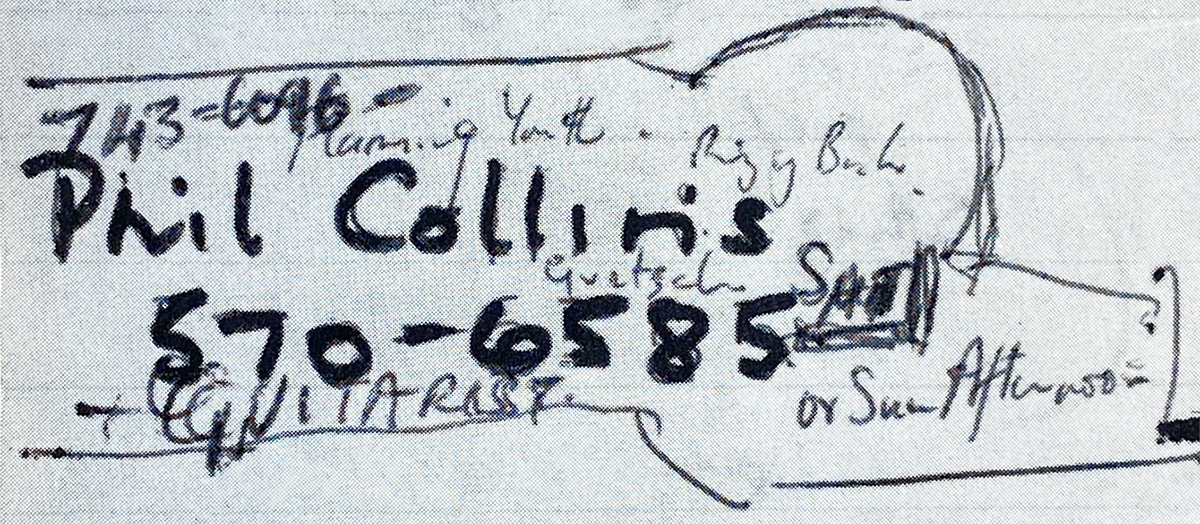 Armando Gallo's book I Know What I Like contains a list of the drummers invited to the audition. The entry for Phil Collins contains his telephone number, the make of his drum kit (Gretsch) and the notations "SAT or Sun Afternoon" and "+ Guitarist" (for Ronnie Caryl, editor's note).