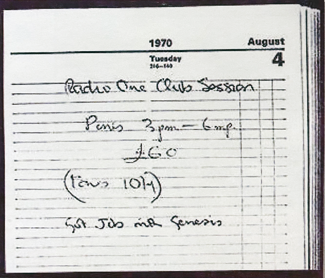How this audition took place is well known. However, the entry in Phil Collins' diary is less well known. There he wrote on 4 August 1970: "Got Job with Genesis". This in turn proves that the audition must have taken place on the Saturday or Sunday before 4 August. Even though Collins writes in his book Not Dead Yet that the audition took place a week later and that he claims to have received Peter Gabriel's call on 8 August [6]. However, we do not consider this version to be plausible in terms of timing, as a look at the 1970 calendar and the progression of the story shows.