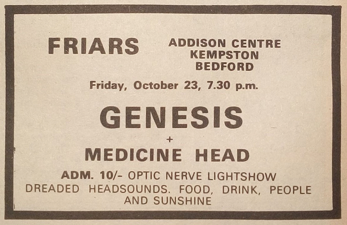Phil Collins has said in various interviews that this concert was a Friars show, but has not mentioned the exact location. You should know that Genesis gave two concerts at a Friars in October 1970, on 6 October in Princes Risborough and on 23 October in Bedford.