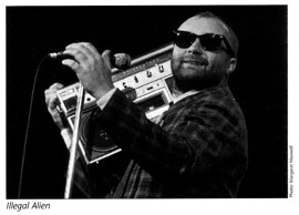 The new stage design was only the first of many interesting changes in this tour. The song introductions had always been something special in Genesis. Peter Gabriel brought them to perfection, while Phil Collins prefers to continue the tradition in a spartan form and on a different level. His announcements on the tour were rather calculated to interact with the audience than tell peculiar stories. When he welcomed the audience he would tell them that the city in which they were was the centre of the universe. After the strong applause he would add that we was going to tell the same nonsense the next day in the next city. His announcement “Tonight we will be playing new songs” (applause), “old songs” (more applause) “and perhaps even some really old songs” (enthusiastic applause) would also get the audience going. The highlight of Phil’s communication with the audience took place before Home By The Sea. It would begin with his excited yell “It’s audience participation time”, and then the complete audience was involved in the “ghosthunting”. The point of the exercise was to get in contact with the “other world”. For this the audience had to stretch their hands into the air which was supposed to make the lights on the ceiling go low. At the end of this “contact making” he asked everybody to put their hands behind their ears and shout: “Masturbation doesn’t make me deaf!” The latter part was dropped over time and not used at all in England. Another famous interaction with the audience led to Illegal Alien. The band put on dark sunglasses; Phil also wore a checkered jacket that was slightly too tight for him and a big radio with a cassette deck. After complaining about the hardships of the tour (“Every night different audiences, different cities, every night different hotel rooms, different girls, different positions, different musicians…”) he held up the radio to his ear and listened to bits of several other songs, e.g. Van Halen’s Jump, Genesis’ Mama or assorted solo songs by Phil – the selection woud vary over time. Funnily enough, a couple of roadies came on stage and sang along during the chorus as a backing choir on their five nights at the NEC Birmingham; this did apparently not happen in the U.S. or Canada.