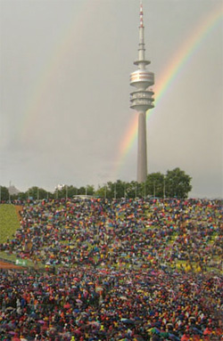 The tour has arrived in Munich. All the ticket holders look up into the sky, listen to the weather forecast … and reach for their rain gear. No permanent rain was announced, but showers, if they occurred, would bring plenty of water. When Christian and I made our way to the stadium the weather looked promising. It was dry, sunny and reasonably warm. The area around the stadium was buzzing with people already; we also met some other members of the fanclub. We then checked out my friends’ places on the main stands. After that they went to the beer garden for a pre-show fan gathering and I went down to the field. Doors opened soon after the sound check and I quickly took up a good place some 20ft from the stage. The front of the field filled quickly while the seats on the stands remained quite empty for a long time.