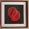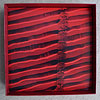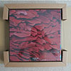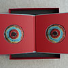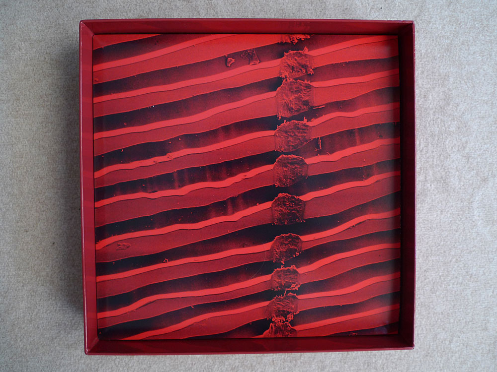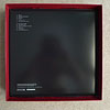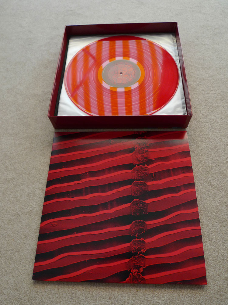 Beneath the art print is the LP. It has all new cover art that looks like slats with a weld point, but it is certainly something organic that has been magnified. The back cover is plain black and provides information on how the twelve songs from the regular version are distributed across the LP sides. The labels on the record itself repeat the artwork from the back of the CD booklet. The record is blood red and – an excellent idea – clear. It will grace every record player.