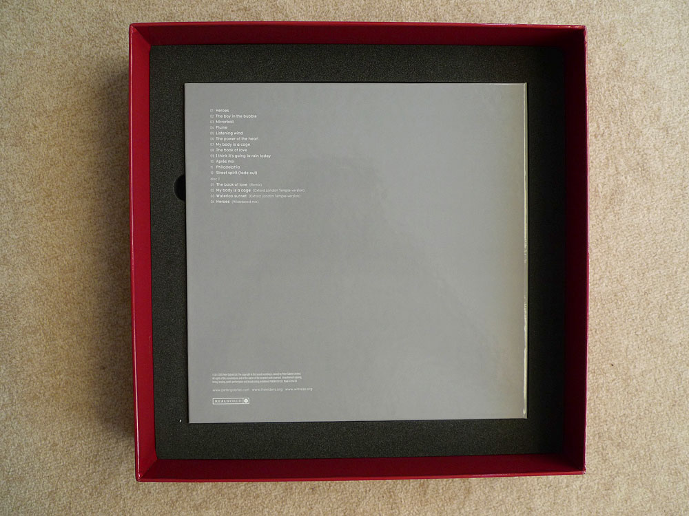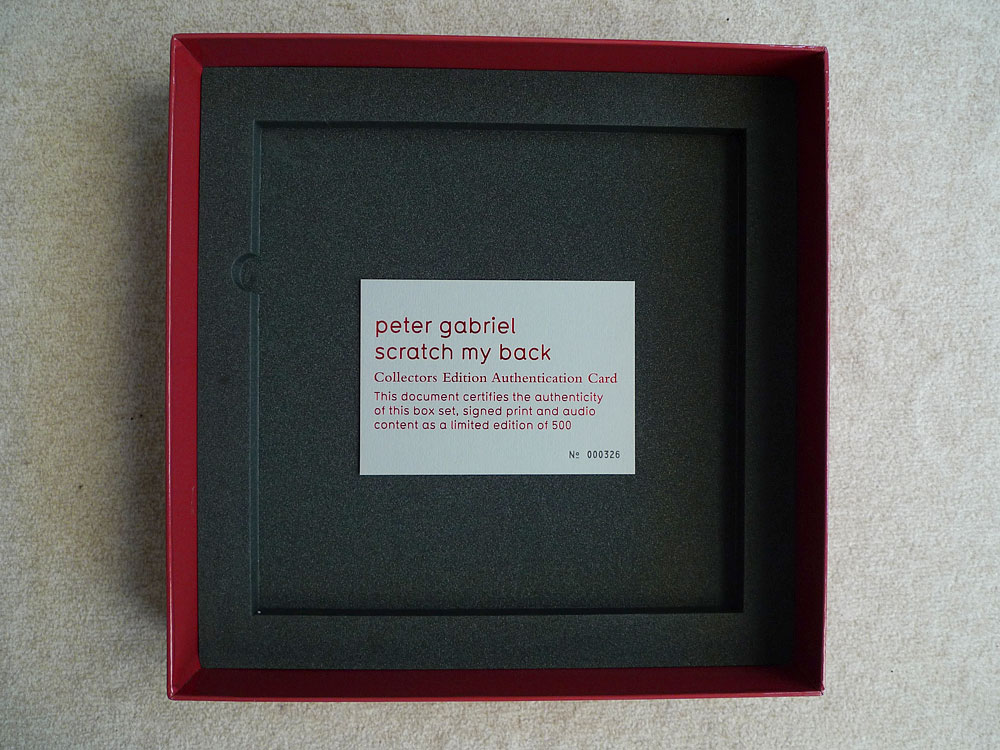 Beneath the foam layer there is a grey sheet the size of the box with Peter Gabriel's introduction to his Scratch My Back project (as in the CD booklet) on the front and the credits for all the songs – all sixteen that are on the Special Edition. The next thing is a sheet of soft tissue to protect the art print of the hand-signed and numbered Scratch My Back cover (31x31cm, the actual print covers 24x24cm).