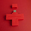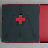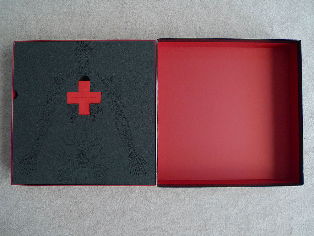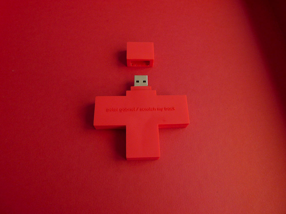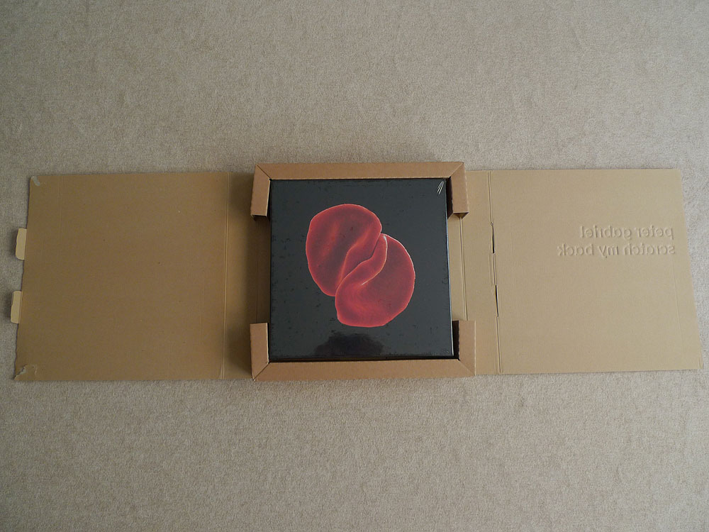 The first thing you will see upon opening the box is an anthracite rubber foam layer about an inch thick into which the positions of the blood vessels in the human body are engraved. This, too, shows good workmanship. Had it been less carefully produced there might have been flaws like torn-out bits or so, but this is absolutely flawless. Right in the middle, where the heart would sit in the human body, there is a cavity in the shape of a plus sign. The upper arm is a bit longer so that you can take out a bloodred plus sign with the embossed text „peter gabriel / scratch my back“. That is the USB stick.