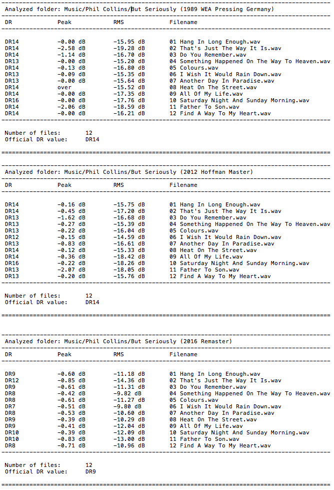 Unfortunately, the dynamic change has been more or less castrated on ...But Seriously. This is no release for audiophiles. The chart shows a large Dynamic Range Value (DRV) of the German WEA first pressing of 1989. 14 is a good value for a 1989 album, high enough to make it into the top third of the charts at LoudnessWar. Phil’s other albums from the 80s have similar values. The new version is down a whopping five points to just 9. A song like I Wish It Would Rain Down with an original DRV of 13 is reduced to a meagre 7. This means: No volume nuances, everything is just loud. If you compare this with Steve Hoffmann’s 2012 High Fidelity Gold Disc Remaster the difference becomes even more clear: Hoffmann created a remaster with only minimal changes to the dynamic range – and it is way better than the 2016 version. …But Seriously confirms the impression that these remasters were created without the necessary diligence. The music is just louder and adapted for the MP3 generation.