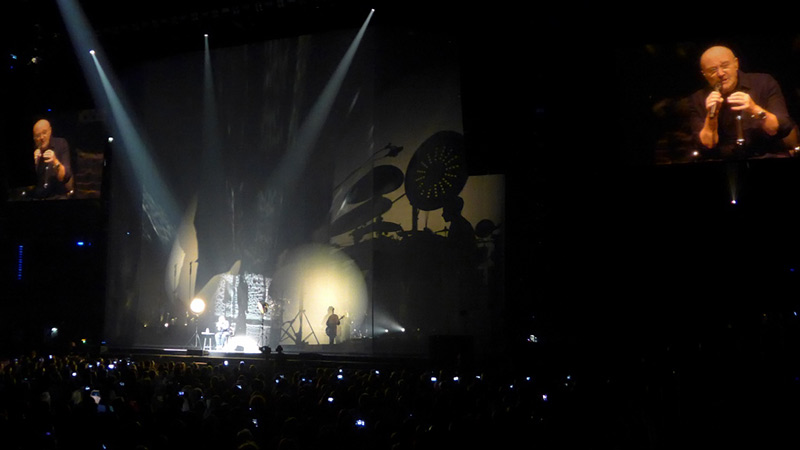 The curtain stays down throughout the first song with the spots throwing the silhouette of the band onto the cloth as a minimalistic background. While at the end of each show of the First Final Farewell tour in 2004 and 2005 a curtain would close at the end of Take Me Home, this curtain opens at the beginning of the second song, revealing the stage. It is much simpler than twelve years ago. There is a platform for singers, brass, keyboards, drums and percussion. Guitars and bass stand in front of the platform. There is a grand piano on the very left, whereas earlier there would only stand an e-piano. Behind the stage there is a 12ft LED screen topped with single varilights. Above these is a classic video screen. The stage design reminds me a bit of the No Jacket Required tour. Less is more. But this stage will show that it is capable of more than it appears to do.