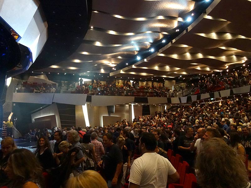 The name of the cruise derived, of course, from the song Close To The Edge by Yes, who were headliners both in 2013 and 2014. On the first cruise Steve Hackett played one of his first Genesis Revisited shows and many of the other bands also performed on both cruises (see list of all bands on the poster at this link). Just like this year, the 2013 cruise had started from Miami to a short side trip to the Caribbean and returned within five days. However, only half of the passengers had come to see the concerts on that first cruise, the other half being regular passengers who didn't care for the music. That worked out quite well, yet for this year’s cruise the organisers drew a lesson out of it and reserved the entire ship for the music passengers. The MSC Divina is able to accomodate more than 4,200 passengers, but only about 2,200 were aboard the ship. That may not have been financially satisfying for the organisers. Still it turned out ideal for the passengers, since the buffets rarely were overcrowded as well as the main shows in the theatre. That theatre has a capacity of less than 2,000 seats, hence the 'big' shows of Yes, Steve Hackett, Marillion and UK have been divided into two groups: The blue and the pink group, according to the cabins. All four bands played two shows on different days and officially you only had the chance to see one of the shows, due to the reservations. In my view this was not a very good arrangement. Of course one would like to see those bands more than one time if there's the chance to do so. However, it turned out that there was a number of seats for members of the 'wrong' group and that you simply had to wait to be let onto the balcony a few minutes before the concerts began. Since that arrangement hasn't been announced, I only learned about it casually just before the first Hackett show started. So I could see every show I wanted in the big theatre, as long as there hasn't been anything more interesting elsewhere. Of course, that is a problem when so many bands play two or three shows in only five days. Hence I missed the shows of Yes, Storyteller and Stick Men (with guest Eddie Jobson), among others.
