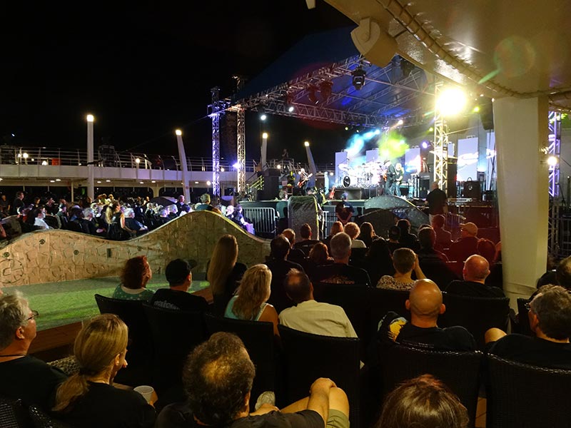 In the theatre were many shows without reservations and I never saw people being turned away due to overcrowding. Many of those bands, like Sound of Contact, PFM or Renaissance, had two shows (one in the theatre and one on the pool stage) and one storyteller. The pool area was completely covered to make room for the stage and the seats. The stage was topped with a sail-like roof, but the area in front had no protection of any kind. Therefore events didn't take place in case of rain, which happened one time. The concert has been caught up on the next day. The rain was part of a storm that rocked our ship to some extend, but that didn't affect the other shows on the other decks. Still, the storm caused the ship not to put into the port of Isla de Roatan (Honduras). Instead we sailed directly to Cozumel, an island near Yucatan, where we stayed for two days instead of just one. There was the possibility to book some excursions, but I didn't take interest in that, as I would have missed some shows. I guess I even wouldn't have complained, if the ship hadn't left the port of Miami due to engine breakdown or any other reason. First and foremost – and even second and foremost – it was all about the music and being among like-minded people and having five days with the comforts of board and lodge (all inclusive except for alcohol and some specialty restaurants).