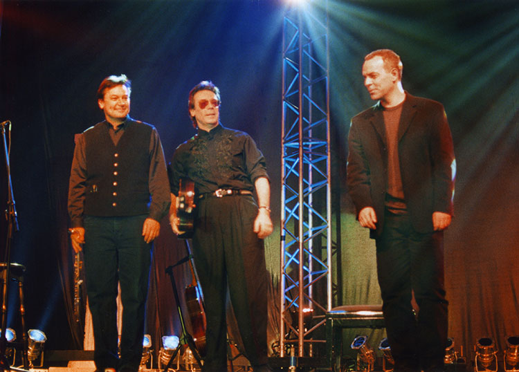 And they don't move much, the three dear gentlemen, who have come to Hungary for the first time to play a one-off concert on January 26, 2002, and now share a spacious stage under spotlights in tropical colours with a backdrop that shows a tasteful selection of impressionistic to naïve slides.