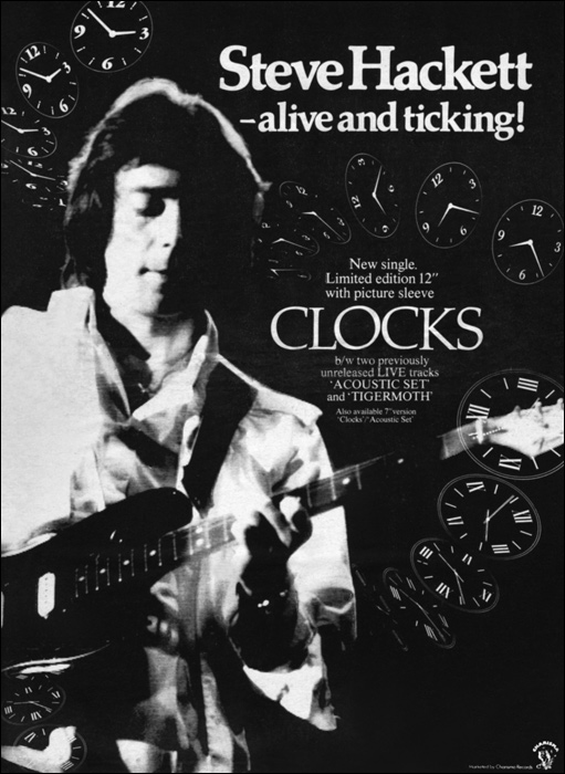 The ticking of a clock as a musical device has not been new since Pink Floyd’s Time. Rarely has it been used as such a dominant rhythmic element as in Clocks (The Angel Of Mons). In this instrumental, drums and sometimes the guitar, too, pick up the tick-tock beat. Incidentally, the original tick-tock sound has at least partly been created on a guitar. The track resembles the title track of Hackett’s previous album, Please Don’t Touch. Steve spreads out a gloomy theme that would work well as the score for a horror film. John Hackett plays threateningly booming bass pedals, then there is a moment of tension when only the ticking can be heard. Then the time bomb finally explodes. Steve’s electric guitar sings (or screams) out her nightmares, John Shearer hits all his drums (and has a big drum solo towards the end of the track). Steve calls this solo “elephants”, and it is, indeed, a demonstration of force that sounds like a stampede of elephants threatening to trample you down. Shearer plays the solo without any overdubs, which is always impressive for audiences as well as band mates in a live situation. Clocks is one of the big live classics in Hackett’s repertoire. The addition The Angel Of Mons in the title refers to a legend from WWI, where members of the British Expeditionary Force were saved allegedly by supernatural forces (or angels) in the battle of Mons in August 1914. Clocks was also released as a single in an edited version, with a Live Acoustic medley (Etude In A Minor, the intro to Blood On The Rooftops, Horizons and Kim) as the flipside. A 12" single version also had a live version of Tigermoth.