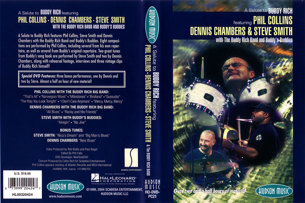 The big band Buddy Rich (who, like Phil, could not read sheet music) founded in 1966 has deeply impressed Phil. Collins makes no bones about it: Yes, Buddy was his reason to set up a big band himself, Phil confesses in an interview that has been released on video to honour the man who outshone even musicians like Gene Krupain. The video contains twelve pieces with the Buddy Rich Band. Phil drums on seven of them and sings on an eighth. For the other four songs two drummers sat down at the kit who have made a name for themselves in the jazz and rock scene, namely Dennis Chambers from Baltimore and Steve Smith, who was in Journey for seven years. Luis Conte, a percussionist who has already played with Phil and bass player Will Lee from David Letterman’s Late Show were also in the band.