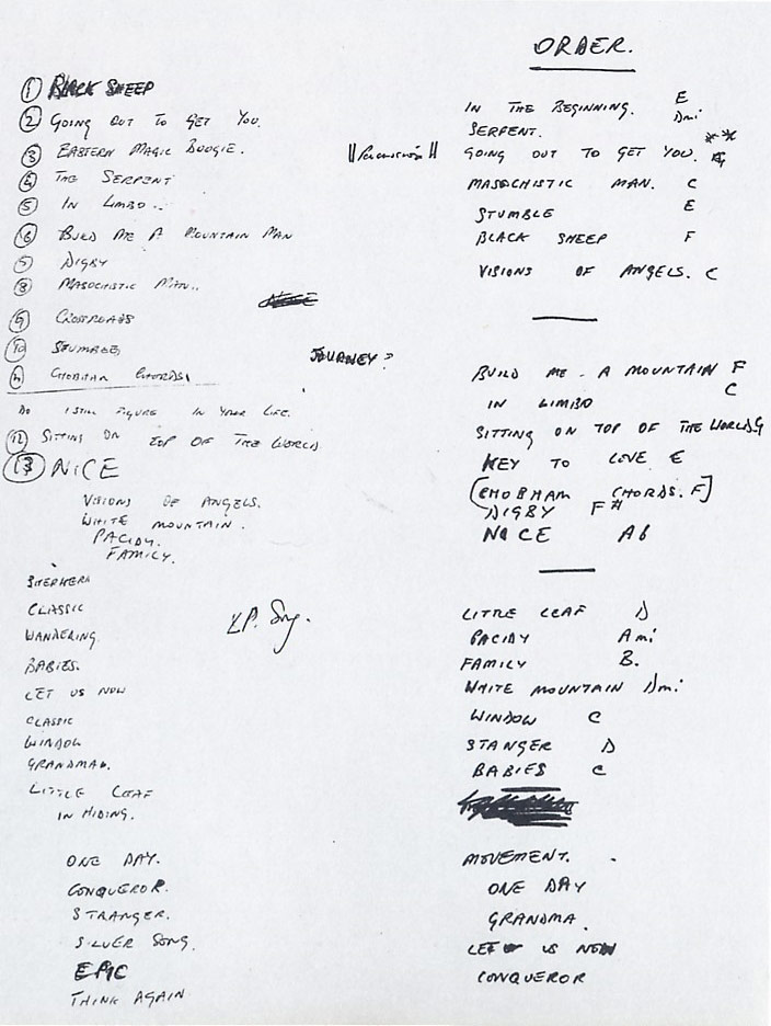 A number of other songs were shortlisted but did not make it into the first live set. Amongst those are cover versions of Crossroads (originally by Robert Johnson in 1937, better known in Cream’s 1968 version) and Do I Still Figure In Your Life? (originally by The Honeybus in 1967, with a more popular version by Joe Cocker in 1969); both were played at later concerts. The shortlist also named In Hiding (from From Genesis To Revelation), Silver Song(Ant wrote the farewell song for John Silver in the summer of 1969; it was recorded in 1973 with Mike Rutherford and Phil Collins), Tony Banks’ song The Shepherd(recorded for the BBC Night Ridesession on February 22, 1970 and played live, too) as well as the unknown songs Eastern Magic Boogie, Classic, Wandering, Epic and Think Again that may have ended up later in different songs.