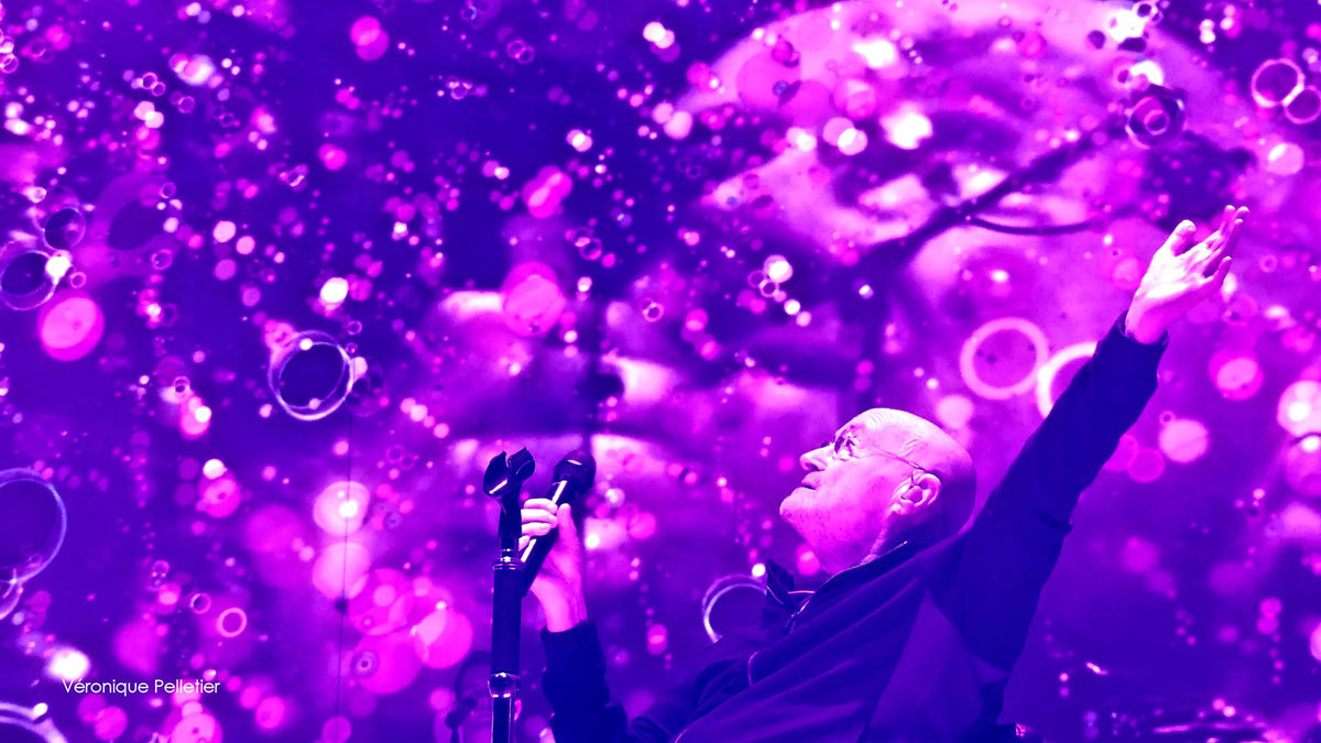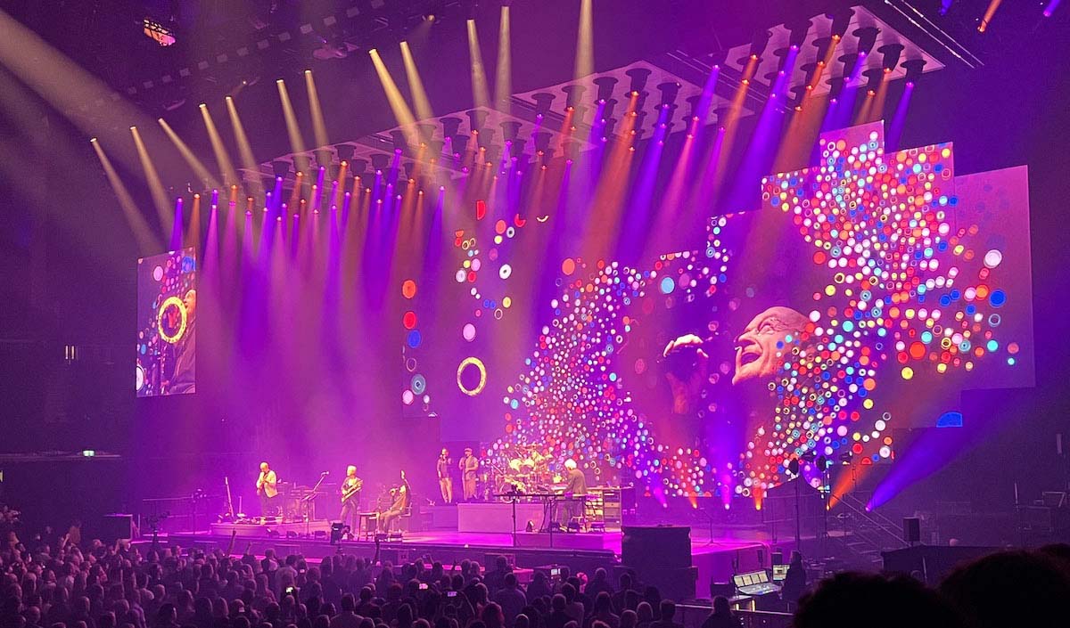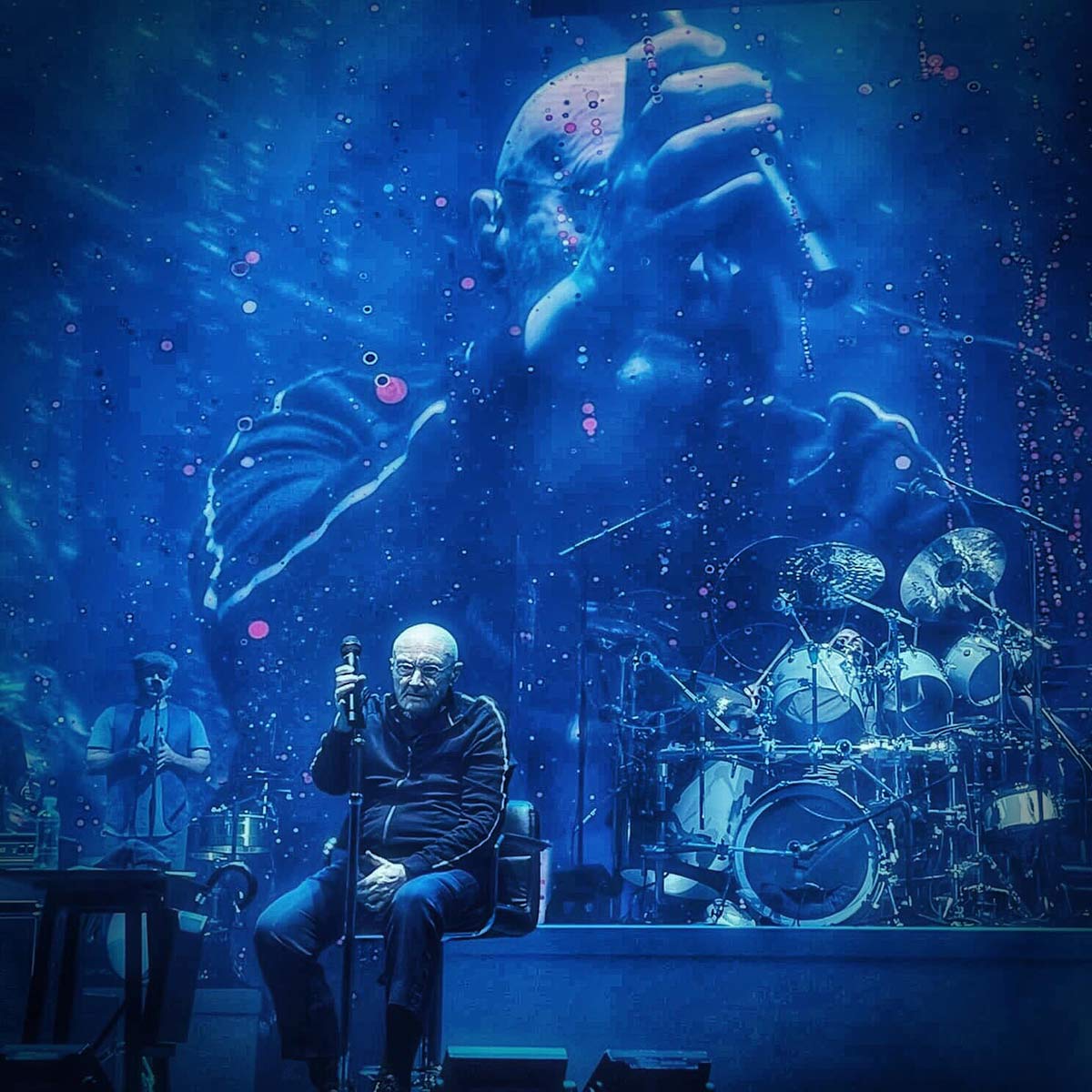 Added to this is a congenial visual backdrop, the video wall is used almost like an actual canvas on which light is used to paint instead of brushes. Camera images and graphic elements are combined with each other, the musical climax in the intro is skilfully illustrated by the graphics. In between, it looks as if Phil Collins’ face is framed by confetti or colourful soap bubbles.