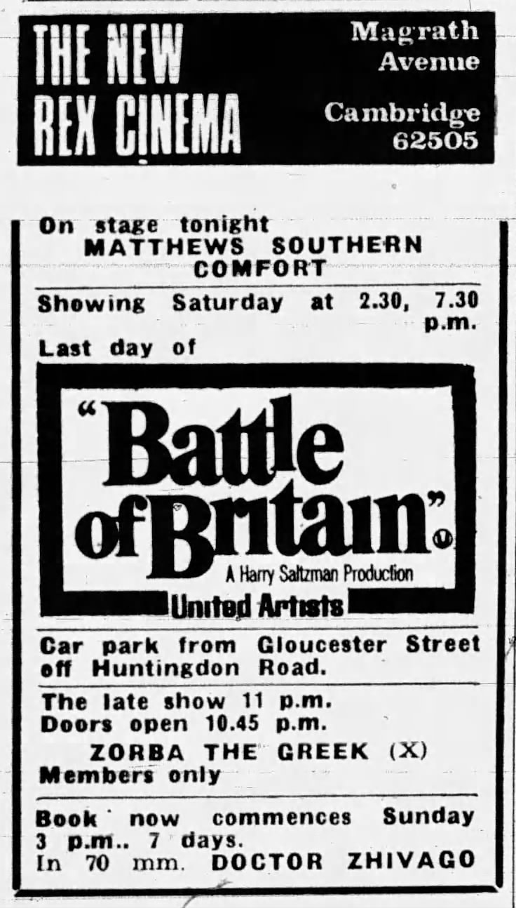 The contradictory statements by Phil Collins and Mick Barnard cannot be conclusively clarified at present. According to their itinerary, a concert was planned for 16 October in Cambridge, but we have not found an advert for the Corn Exchange on that date. However, it is mentioned in various tour date listings that the band played at the Rex Cinema as support act for Matthews Southern Comfort. Matthews Southern Comfort were a band who, like Genesis, had also appeared on the BBC’s Disco 2 programme and also had a number 1 hit with their single Woodstock in October/November 1970. We have two adverts for Matthews Southern Comfort at the New Rex Cinema, but unfortunately without any mention of Genesis, which is no proof as to whether Genesis played there that day or not.