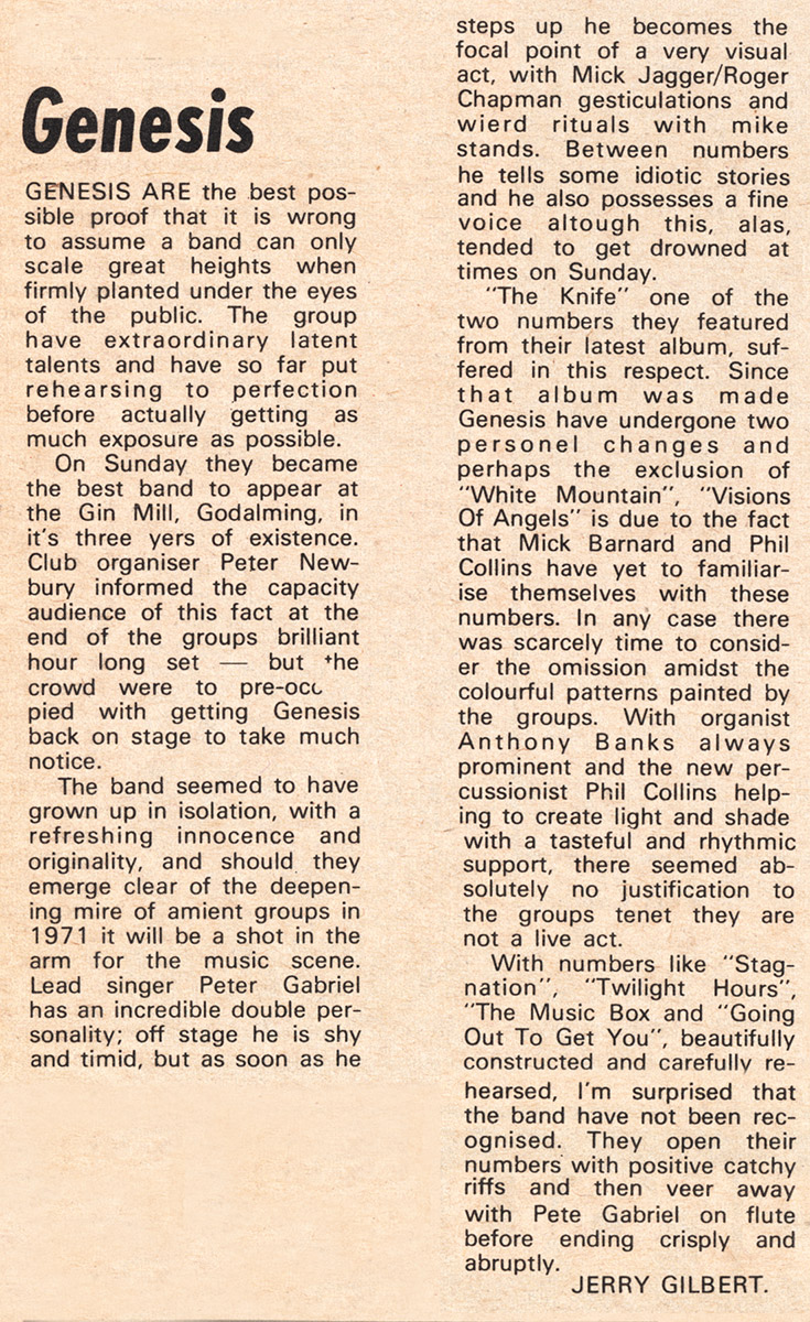 In the search for further evidence of Barnard’s time with Genesis, unfortunately not much is available in the music press. On the one hand, there is an article by Jerry Gilbert in the music magazine Sounds from 26 December 1970, which reports on the concert on 20 December in Godalming and also mentions Mick.