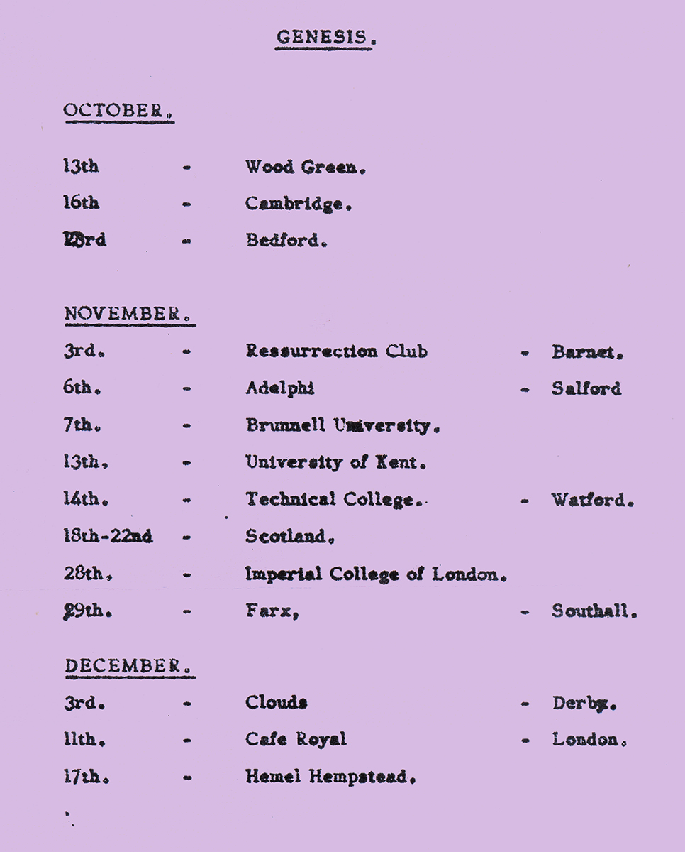 Oh yes I remember some of the gigs. Particularly places like Heriot-Watt University during the tour of Scotland, and Farx Club – I remember that quite well. And The Lyceum. I’m pretty sure I did one of the Lyceum shows. The ones that I remember the most are the ones which are on my little yellow sheet which Tony Stratton Smith used to give us. He would never spell Genesis correctly, he would put Genisis.“