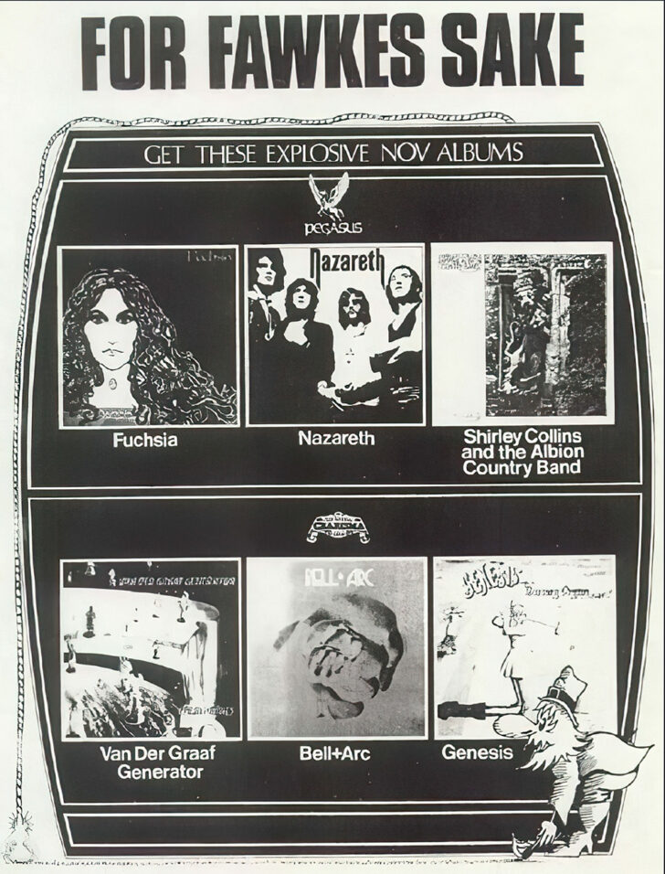 There is also another ad that stands out. In November it appears full-page under the title “For fawkes sake/Get these explosive Nov albums” and promotes three Pegasus albums as well as the three Charisma albums. And then on 4 Dec, they are reviewed together in Record Mirror, on one page.