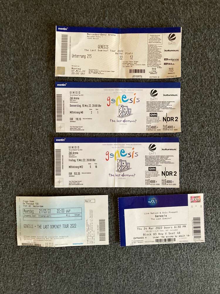 …and shortly before the trip to London, this very virus – for the fourth time – threw a spanner in the works: several band members and their relatives had contracted the corona virus despite vaccination, so that Genesis could not complete their UK tour in October 2021 as planned. The second Glasgow concert and the three London concerts had to be cancelled or postponed. For us, this meant that we found out on Friday afternoon that we would not be travelling to London on Monday. We had to postpone our accommodation booked shortly before and the flights (the EuroStar was suspended due to the pandemic and therefore not an option) until unknown. Emotionally, I was at the point of saying that fate just didn’t want me to see my favourite band again – after all, at that point I had tickets for 5 of the only 6 concerts of the tour that had not taken place. However, as fate (or capitalism) would have it, the postponement of the London concerts once again opened up a window of opportunity that I would make massive use of: Genesis were able to find a free slot in the London O2 Arena schedule for the end of March 2022, almost exactly two years after the announcement, to put the Last Domino? Tour – and with it the live band Genesis – “to bed”, as Phil Collins expressed it in a BBC interview. In order to make these three final concerts logistically viable, a dozen more shows were added to the weeks before the London concerts. This gave Genesis the opportunity to visit their regular audience in Germany, France and the Netherlands, who had been loyal to the band for decades, and to say a fitting farewell. The advance ticket sales were quite relaxed – the prices were back at the level of Phil’s 2017 tour and I got almost all the tickets I wanted: The opener in Berlin (upper tier next to the stage), both shows in Hanover (once from the long shot in the upper tier; once with family in the main grandstand) and finally the first night in Amsterdam, because there should be standing tickets for around 110 euros. Taking time off was not a problem because of my job – I was more worried about the skiing trip with about 25 people that was in my calendar between Hanover and Amsterdam… A classic first world problem.