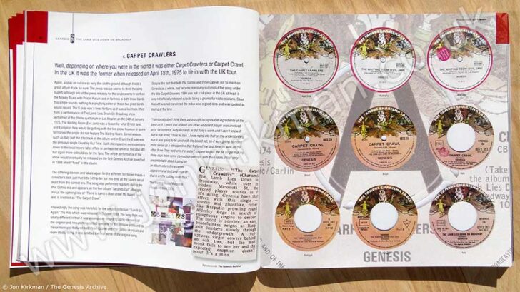 With this, the book turns to the release history of the album. Essential information for individual releases is accompanied by a flood of images (sleeves, singles, advertisements, reviews). Counting Out Time is first. Second is a little-known acetate, the so-called Genesis Christmas Acetate. Discussion of the Carpet Crawlers single leads to the 1999 recording of the song, and Steve Hackett feels strongly about that. The single for The Lamb Lies Down On Broadway shifts the focus to the whole album and its live performance.
