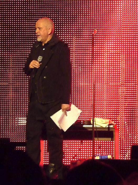 He lost track of the lyrics in one or two songs, but he used the teleprompters less than the day before, or at least he was more discreet about it. His voice was as strong as the day before, and he kept drinking tea and something else from a small bottle to keep it that way. The first part was played through without special announcements, and Gabriel announced a 15 minute break after that.