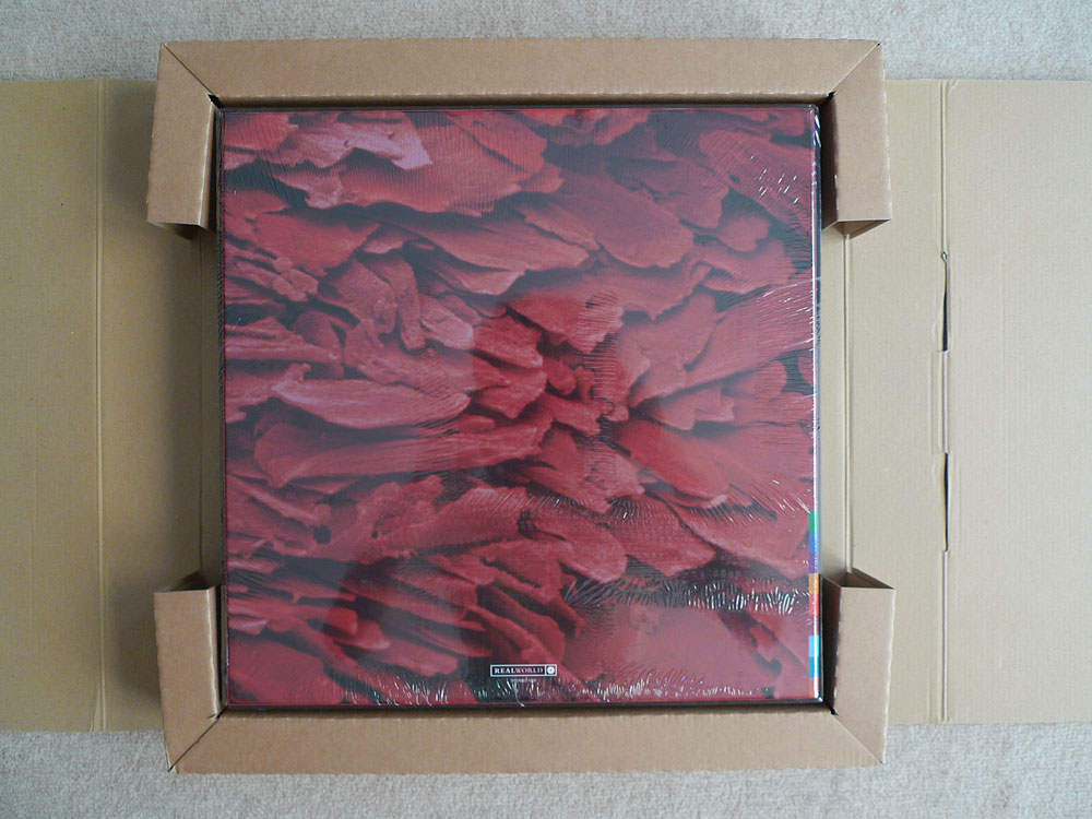 Beneath the art print is the LP. It has all new cover art that looks like slats with a weld point, but it is certainly something organic that has been magnified. The back cover is plain black and provides information on how the twelve songs from the regular version are distributed across the LP sides. The labels on the record itself repeat the artwork from the back of the CD booklet. The record is blood red and – an excellent idea – clear. It will grace every record player.