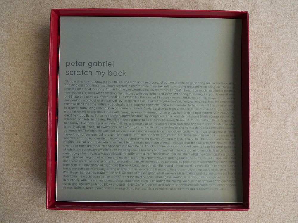 Beneath the foam layer there is a grey sheet the size of the box with Peter Gabriel’s introduction to his Scratch My Back project (as in the CD booklet) on the front and the credits for all the songs – all sixteen that are on the Special Edition. The next thing is a sheet of soft tissue to protect the art print of the hand-signed and numbered Scratch My Back cover (31x31cm, the actual print covers 24x24cm).