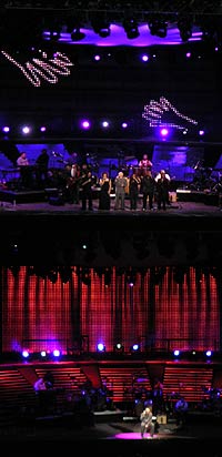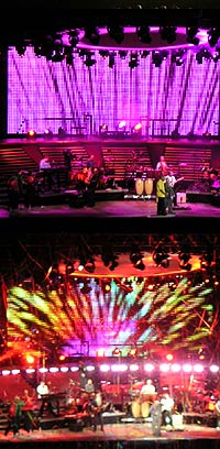 The backing vocalists and the brass section stand here for some songs and Phil also occasionally walks across it. On the lower level there are (from audience left to right) Chester’s drum kit, Luis Conte and his percussion and, Phil’s drum kit where he sits (all to rarely) when required. For In The Air Tonight Phil walks about calmly, but just when he should be arriving at his drum kit he is just so far away from it and one wonders how on earth he is supposed to make it there on time.
