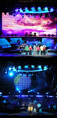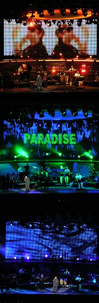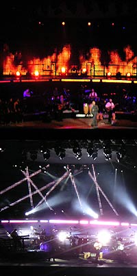 There is no particular theme or motto for the stage this time. It is a simple stage at the end of the venue or stadium that both fits big halls and does not seem puny in open air settings. Only the video screens are much larger open air than indoors; during the show they almost always show what’s happening on stage. There are two levels to the stage, the upper level being only a sort of catwalk.