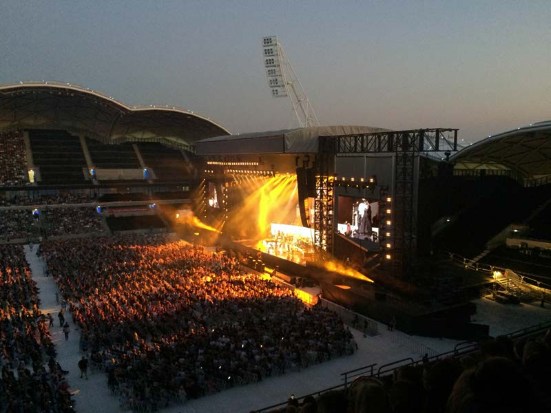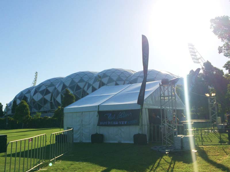 The AAMI is no giant stadium by European standards, but a rather compact building that is closed at the sides and has wave-shaped roofs on grandstands of different heights. In a way, the building resembles the hexagonal shapes on a football. I experienced remarkably good acoustics on both seats. There was no support act except for a local radio DJ who did his best from 7 to 8 to warm up the stadium with dance music from the 80s (Michael Jackson, Earth, Wind & Fire etc.). Local staff were relaxed; there were official merchandise stall already outside the stadium, and lots of promotion stuff by sponsors. At the stand of one radio station you could slip into a gorilla costume and drum along to the drum fill from In The Air Tonight on a bass drum. I enjoyed the creativity of the management in the stadium. There were many signs with security advice and other information, and these had captions lifted from Phil Collins’ current setlist (e.g. “Dance Into The Light – however, please keep the aisles clear”, or “You Can’t Hurry Love – for your safety, please don’t run”). The Friday show was pretty much sold out, while you could still get the odd ticket for the additional show in Saturday. On the days of the show I hardly noticed any free seats.
