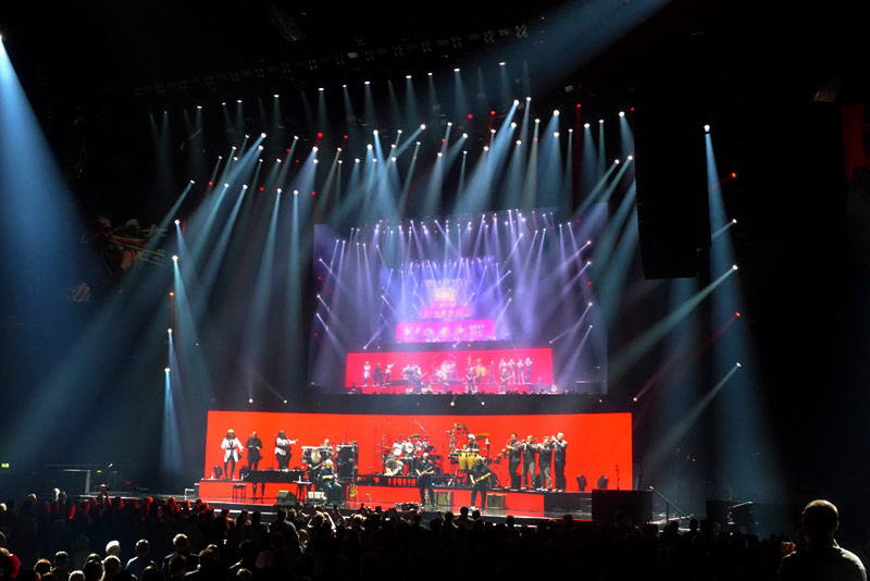 The curtain stays down throughout the first song with the spots throwing the silhouette of the band onto the cloth as a minimalistic background. While at the end of each show of the First Final Farewell tour in 2004 and 2005 a curtain would close at the end of Take Me Home, this curtain opens at the beginning of the second song, revealing the stage. It is much simpler than twelve years ago. There is a platform for singers, brass, keyboards, drums and percussion. Guitars and bass stand in front of the platform. There is a grand piano on the very left, whereas earlier there would only stand an e-piano. Behind the stage there is a 12ft LED screen topped with single varilights. Above these is a classic video screen. The stage design reminds me a bit of the No Jacket Required tour. Less is more. But this stage will show that it is capable of more than it appears to do.