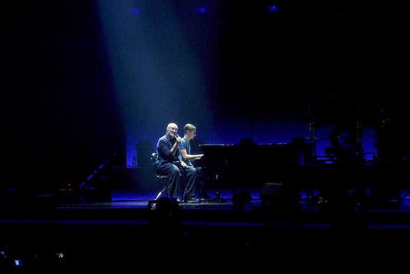 A few minutes and they are back for the scheduled encores. There is much more light and shadow for me in them. I will begin with the light as it matches the chronology. Only Phil and Brad Cole return to the stage for the first encore. It is the English version of Edith Piaf’s Hymne à l’amour with the English title If You Love Me (Really Love Me). It is the second song Phil does not sing from his chair and the only one he actually performs standing. Or at least, leaning on the grand piano. The lyrics and the performance match perfectly.