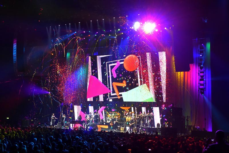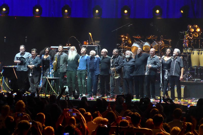 There is the familiar trio of singers, him with Arnold McCuller and Amy Keys.Phil sits between them and looks strangely tall.There is a degree of (intentional?) comedy in it, and it does not seem weird because it seems funny. It is a different story with Sussudio. I could not say why, but Phil looks out of place sitting down. He taps his left foot faster than for any of the previous songs, and Sussudio begins in its usual colourful way with confetti and streamers, but it somehow does not really fit into this show. Phil’s vocals seem not the best here, for the first time this evening, and I had the feeling he has a problem with his timing. It all seems a bit forced, like the song people want to hear, and Phil not wanting to let them down. The audience does not mind. As usual, the band bows and leave the stage after Sussudio.