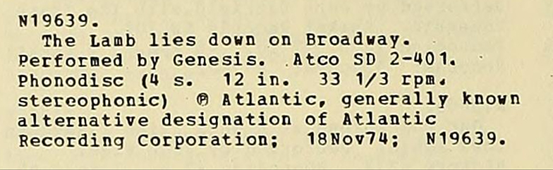 The first thing we discovered in the Catalog of Copyright Entries 1974 was the entry / data for The Lamb. There it is noted as copyright: 18Nov74. The catalogue, which is published by the US Copyright Office, contains a list of all copyright entries received, but unfortunately not the actual release date. But it can be assumed that the album was supposed to be released in the USA on 18 November 1974, as the entry in the catalogue and the press release from 1990 suggest.