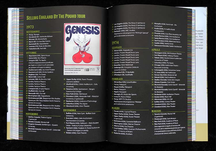 As mentioned earlier, another big chunk of each chapter is constituted by the “In Concert” section. This is quite for a good reason with Genesis, particularly in the first years, being a band performing many live shows. The Selling England By The Pound tour, extending almost a year from September 1973, was the first tour with “a first class theatrical stage assembly” (Giammetti). Although by the time fitted with a massive song catalogue and staging for the first time even at bigger venues, the chapter also points out the advent of discord within the band, particularly due to Gabriel’s omni-present, characteristic personality and live appearance, obscuring in a way the other musicians’ performances. Nevertheless the author considers the band at this point in time “at the maximum”.